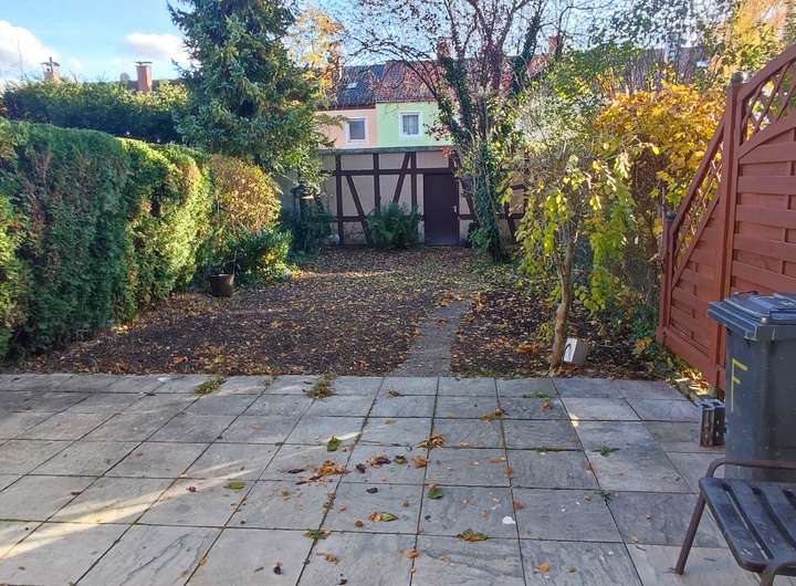 Terrasse und Garten. Einzelhofgarage Zugang mit Türe vom Garten.