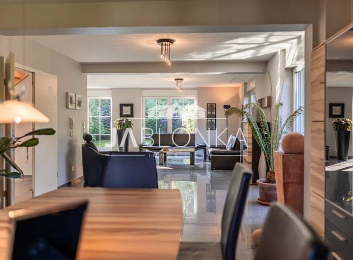 Beim Betreten empfängt ein heller Eingangsbereich, der alle Ebenen des Hauses miteinander verbindet. Zur Rechten liegen das Gäste-WC und die SieMatic-Küche mit BOSCH-Einbaugeräten und Zugang in den vorderen Garten. Geradeaus öffnet sich das großzügige Wohn- und Esszimmer mit Zugang zur südlich ausgerichteten Terrasse und in den liebevoll angelegten Garten. Große Fensterflächen schaffen Helligkeit, Weite und einen harmonischen Übergang nach draußen. Hochwertige Fliesen im gesamten EG unterstreichen den gepflegten Eindruck und verleihen dem Raum eine klare, zeitlose Ästhetik.