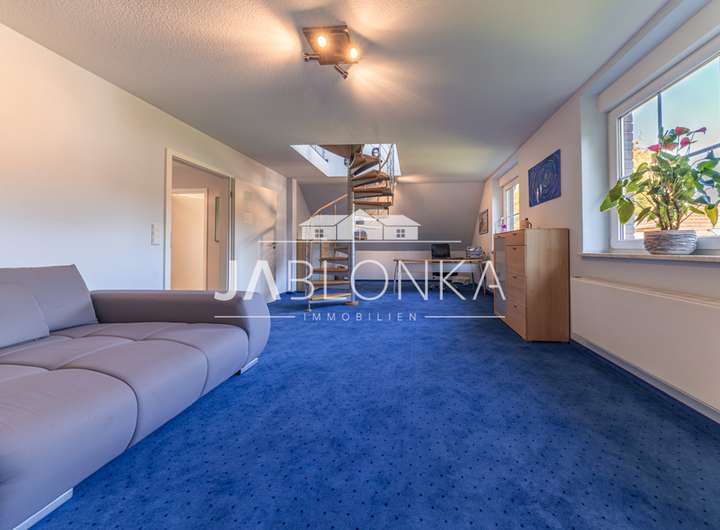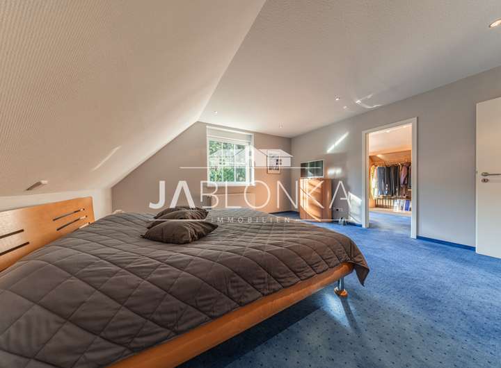 Im OG erwarten Sie ein großes Schlafzimmer mit angrenzendem Ankleidezimmer, ein komfortables Vollbad mit Wanne und Dusche sowie ein weiteres, sehr geräumiges Zimmer – ideal als Kinderzimmer oder Büro. Von hier führt eine Wendeltreppe in das ausgebaute DG, das sich hervorragend als Gästezimmer oder Rückzugsbereich eignet.