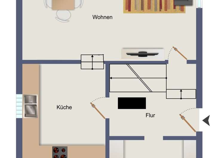 Das Haus verfügt über ein schönes Wohnzimmer, Küche sowie Badezimmer (Anbau) im Erdgeschoss sowie ein gemütliches Schlafzimmer (unter der Dachschräge) und Arbeitszimmer im Obergeschoss. Außerdem ist auch ein Keller vorhanden. Das Haus wird mit einer modernen Gas-Zentralheizung (Brennwert-Therme) beheizt.