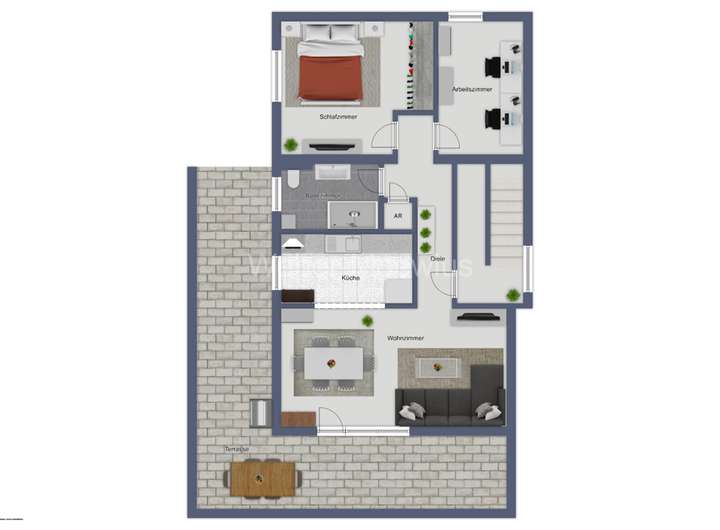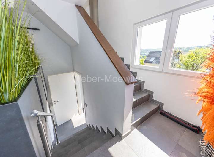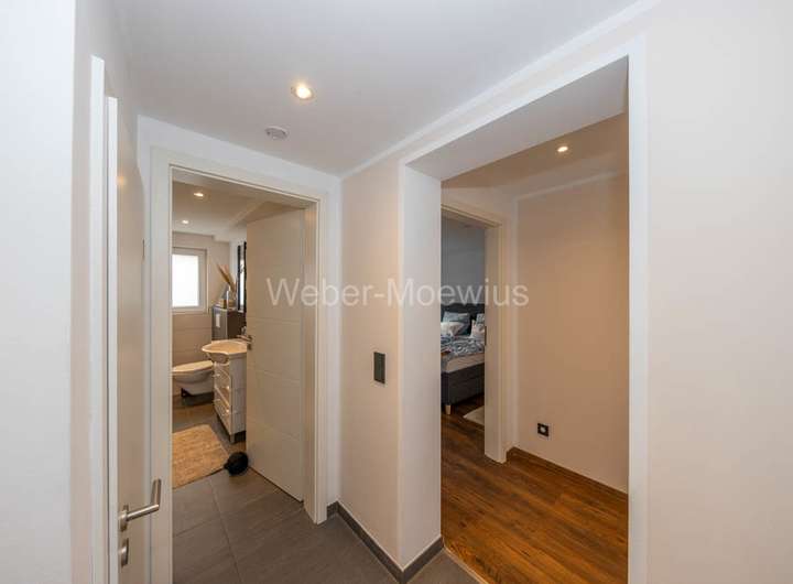 Die Einliegerwohnung im Untergeschoss ist ebenfalls über den gemeinsamen Hausflur und einige Stufen erreichbar. Links von der Diele liegt der große Wohn-/Essbereich mit offener Küche. Vom Wohnbereich aus haben Sie Zugang zur Terrasse, die noch weiter um das Haus verläuft. Wieder in der Wohnung zurück, erreichen Sie von der Diele aus das moderne Duschbad und zwei Schlafzimmer. Eines davon kann nach Ihren Wünschen auch als Büro oder Gästezimmer genutzt werden. Ein kleiner Abstellraum, in dem sich die Heiztherme befindet, steht Ihnen ebenfalls zur Verfügung.