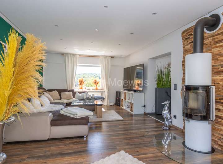 Kommen wir zur Aufteilung: durch den Eingangsbereich gelangen Sie in den Hausflur. Hier erreichen Sie über eine kleine Treppe nach oben die Hauptwohneinheit. Diese ist unterteilt in Wohnzimmer mit Kaminofen, Duschbad und dem großen Essbereich mit offener Einbauküche. Diese punktet im modernen und hochwertigen Design. Vom Essbereich aus haben Sie Zugang zu einem der zwei Balkone. In der warmen Jahreszeit lädt dieser zu gemütlichen Grillabenden mit Freunden und Familie ein - Ihre persönliche Oase, die Ihnen Privatsphäre und Abstand vom hektischen Alltag bietet.