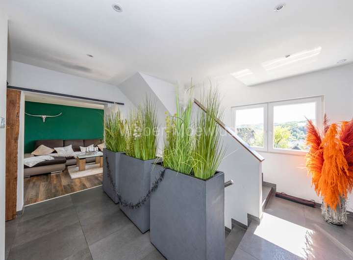 Zurück in der Diele geht es über eine Treppe hinauf zum Flur im Obergeschoss. Hier finden Sie drei Zimmer, eine separate Ankleide mit Waschmaschinenanschluss und ein Duschbad. Von einem der Schlafzimmer aus haben Sie Zugang zum zweiten Balkon. Über eine Luke im Flur gelangen Sie zum ausgebauten Spitzboden, der weiteren Stauraum bietet.