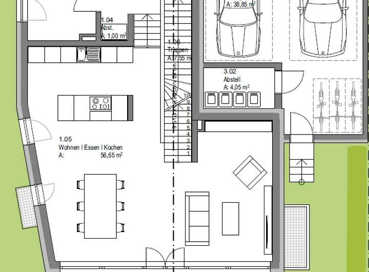 - Bepflanzung (Erstanlage Rasenflächen, Hainbuchenhecke entlang der Grundstücksgrenzen)