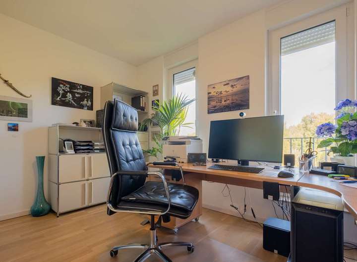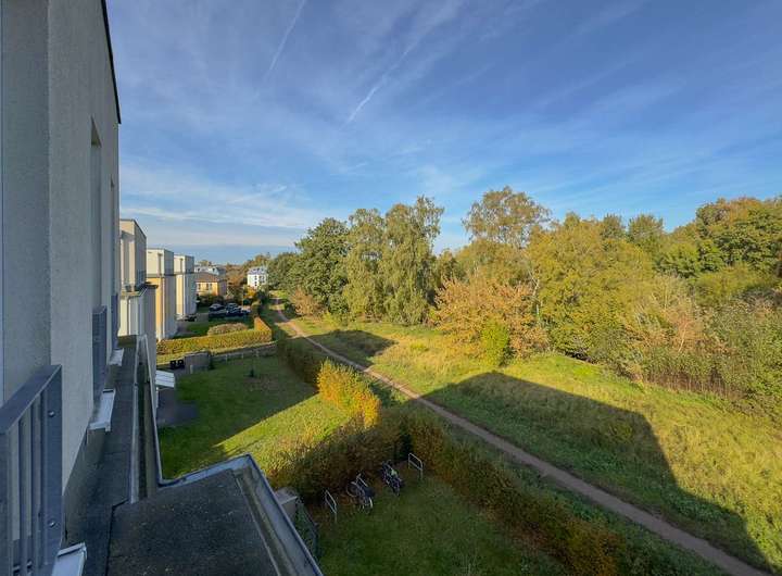 Der großzügige moderne Flur der Wohnung verbindet sämtliche Räume harmonisch miteinander. Der helle Wohn- und Essbereich mit integrierter Küche schafft ein einladendes Ambiente. Von hier aus gelangt man auf die weitläufige und nach Süden ausgerichtete Terrasse mit elektrischer Markise, die einen weiten Blick über die Gartenstadt bietet. Das Badezimmer überzeugt mit einer geschmackvollen Ausstattung inklusive Badewanne und Dusche. Schlafzimmer und Arbeitszimmer bieten eine schöne Sicht in den grünen Garten.