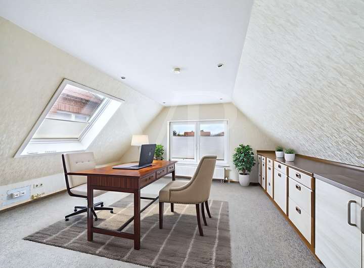 Das Nebengebäude wurde vielseitig ausgebaut: Über der beheizten Doppelgarage mit 5 Meter breitem Sektionaltor und Bewegungsmelder befindet sich ein vollwertiger Büroraum. Eine zweite Wohneinheit ist ebenfalls im Haupthaus realisierbar. Anschlüsse für eine Küche sind in einem Raum im Obergeschoss vorhanden. Ebenfalls ein bodentiefes Fenster, das den Zugang zu einer kleinen geschützten Dachterrasse zwischen beiden Gebäuden ermöglicht.