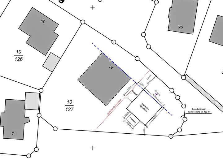 Das Eckgrundstück (quasi eine Baulücke) wird voraussichtlich eine Größe von ca. 433 m² umfassen. Ein positiver Bauvorbescheid für ein Einfamilienhaus mit einer Grundfläche von 9 x 9 Metern, einem Vollgeschoss nebst einem ausgebautem Dachgeschoss liegt bereits vor – ideale Voraussetzungen für modernes, familienfreundliches Wohnen mit viel Gestaltungsspielraum.