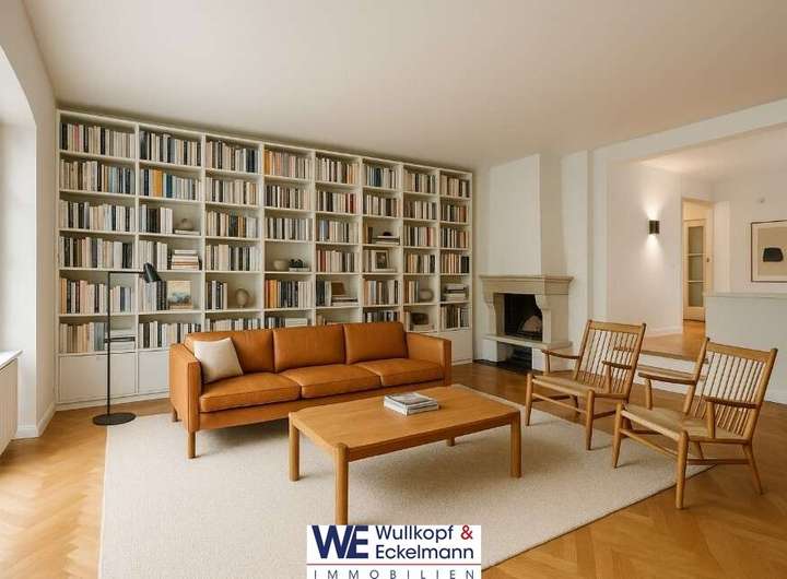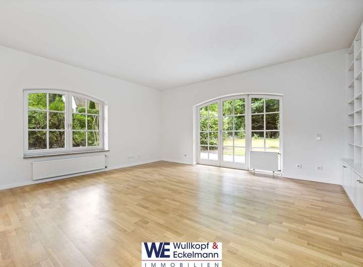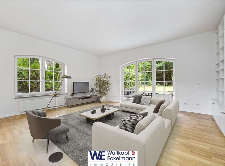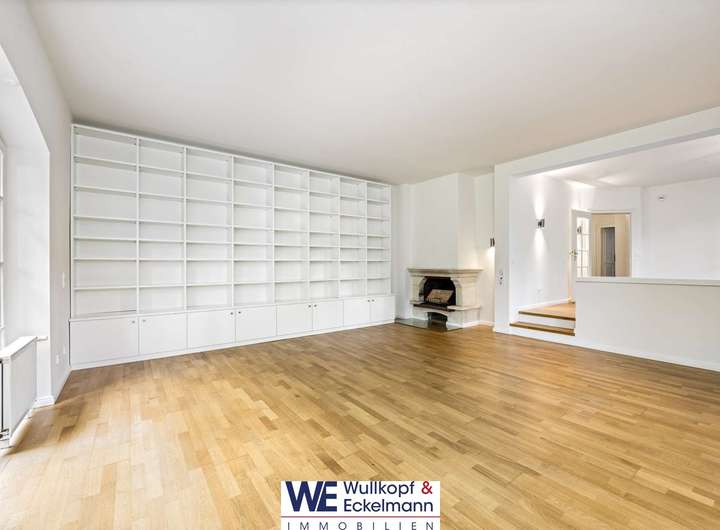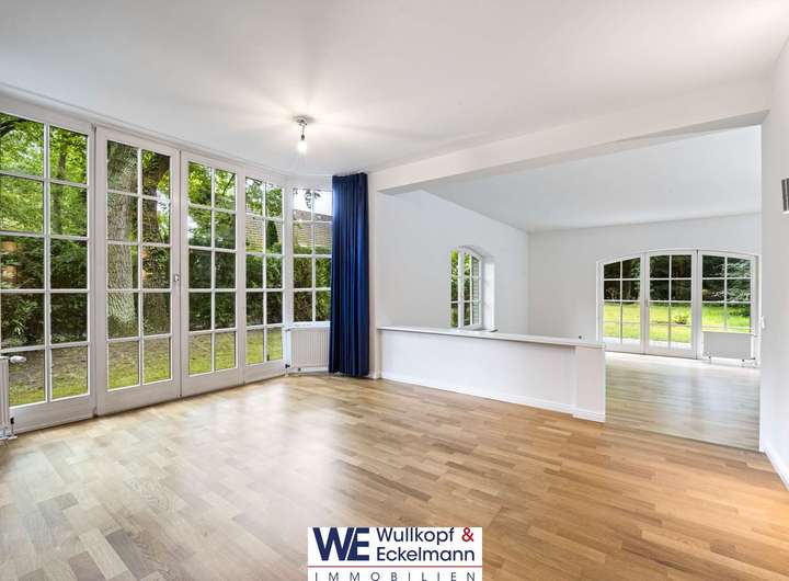 Eine Tür mit Glaseinsätzen führt Sie in den lichtdurchfluteten Essbereich mit bodentiefem Erkerfenster und direktem Zugang zur Ost-Terrasse. Nur zwei Stufen tiefer öffnet sich der angrenzende Wohnbereich mit einem gemütlichen Kamin. Der offen gestaltete Wohn-/Essbereich bietet viel Platz zur individuellen Möblierung und einen traumhaften Blick in den parkähnlich angelegten Garten. Zwei große Tür-Fenster-Elemente verbinden harmonisch Innen- und Außenraum.
