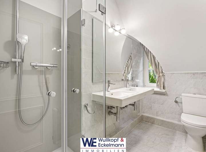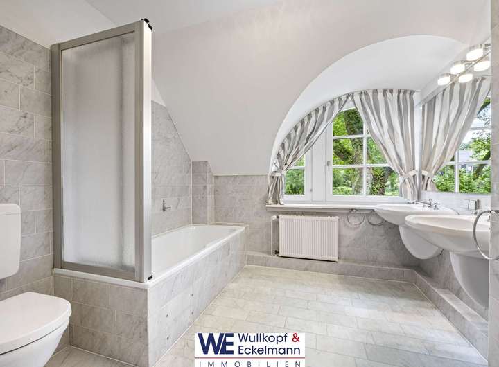 Beide Bäder sind mit hellem Marmor, Fußbodenheizung und einem Fenster ausgestattet. Das Hauptbadezimmer verfügt zudem über eine Badewanne und zwei Waschbecken – ideal für den Familienalltag. In 2025 wurde im Duschbad eine tieferliegende Duschwanne mit Glastrennwand neu eingebaut. 2024 wurden die Toiletten im Gäste-WC und im Wannenbad ausgetauscht, um höhere Sitzfläche zu erhalten.