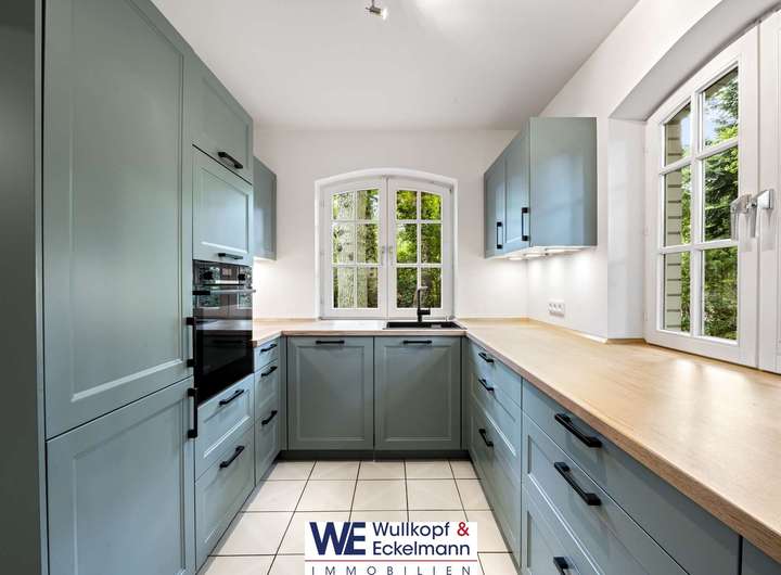 Die moderne Einbauküche inklusive gängiger Elektrogeräte wurde erst 2022 neu eingebaut und profitiert von natürlichem Tageslicht durch zwei Fenster.