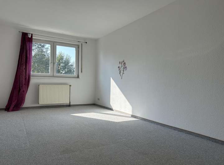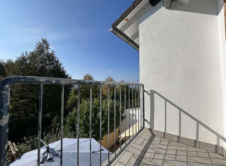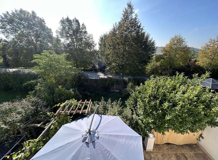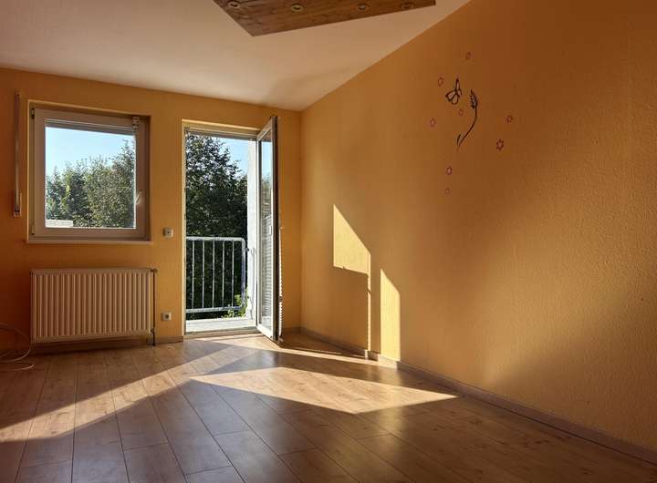 Im Obergeschoss stehen Ihnen drei gut geschnittene Zimmer sowie ein helles Badezimmer mit Badewanne und Dusche zur Verfügung. Vom Flur aus haben Sie Zugang zu einem Balkon, der einen schönen Blick ins Grüne bietet.
