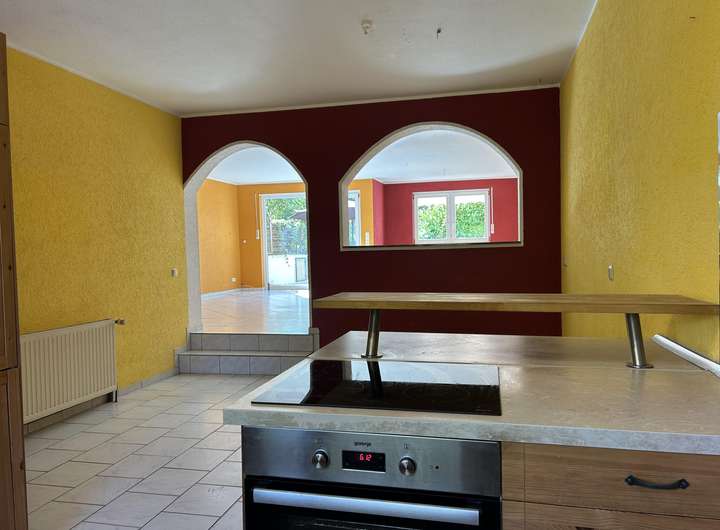 Bereits beim Betreten des Hauses empfängt Sie ein einladender Eingangsbereich mit Garderobe und Gäste-WC. Im Erdgeschoss befindet sich der großzügige Wohn- und Essbereich mit offener Küche – ein harmonischer Mittelpunkt des Hauses. Eine kleine Stufe gliedert den Raum optisch, und von hier aus gelangen Sie auf die sonnige Terrasse mit anschließendem Garten – perfekt für entspannte Stunden im Freien.