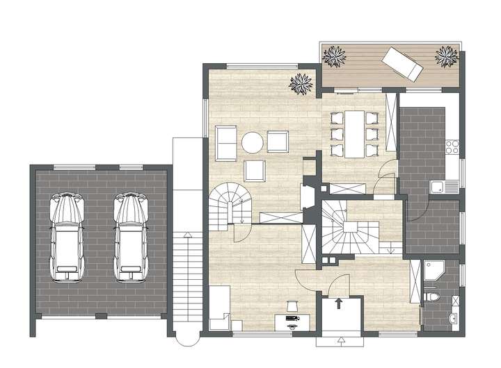 Doppelgarage und zusätzliche Stellplätze sorgen für Komfort und praktische Alltagstauglichkeit.