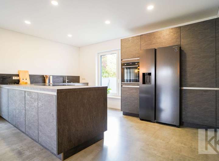 Der offen gestaltete Wohn- und Essbereich mit hochwertiger Einbauküche bildet das Herzstück des Hauses. Von hier gelangen Sie direkt auf die Terrasse und in den Garten – perfekt für gemeinsame Stunden im Freien. Der angrenzende Hauswirtschaftsraum bietet Stauraum und Zugang zu allen technischen Anschlüssen; über eine separate Tür erreichen Sie den Carport – ideal für kurze Wege beim Ankommen oder Einkaufen.