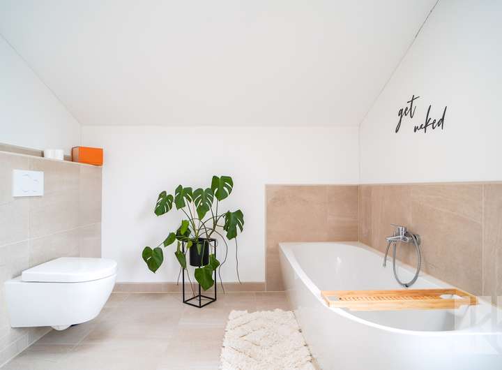 Eine elegante Treppe aus Eiche und Stahl führt in das Obergeschoss, das mit hohen Decken, großen Fensterfronten und einer offenen Galerie beeindruckt. Das stilvolle Badezimmer ist mit sandfarbenen, großformatigen Fliesen, Badewanne, Dusche, WC und Fenster ausgestattet. Das Elternschlafzimmer bietet eine entspannte Atmosphäre mit viel Licht, während zwei weitere Zimmer flexibel als Kinder-, Gäste- oder Arbeitszimmer genutzt werden können.