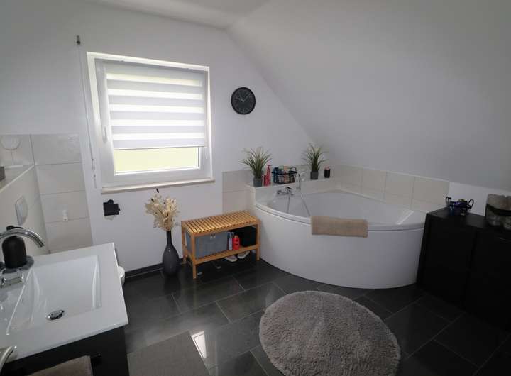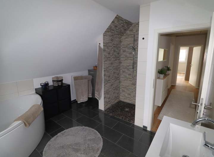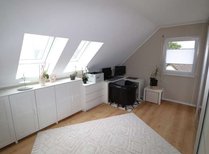 Über eine Treppe gelangen Sie in das Dachgeschoss. Diese Etage ist mit einem Schlafzimmer, einem Kinderzimmer, einem weiteren Kinderzimmer mit Ankleidebereich, einem Tageslicht-Badezimmer mit Eckbadewanne, bodentiefer Dusche und WC, sowie einem Hauswirtschaftsraum ausgestattet.