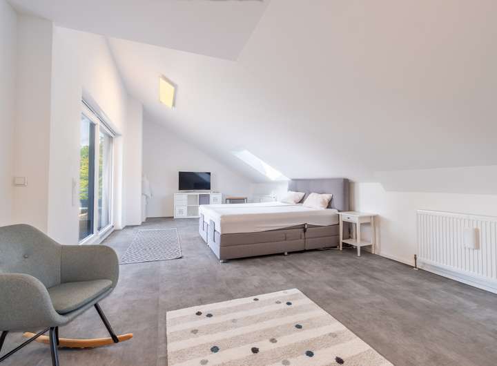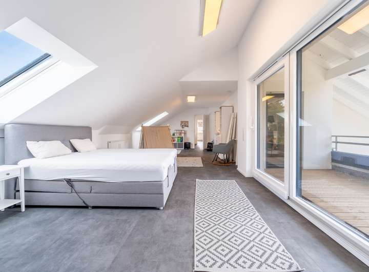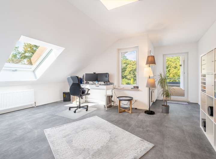 Im Obergeschoss befindet sich ein großer Balkon, der sowohl vom Elternschlafzimmer als auch vom derzeit als Büro genutzten Raum zugänglich ist. Das Elternschlafzimmer verfügt auf dieser Etage zudem über separate Anschlüsse, um bei Bedarf eine kleine Küche einzubauen.