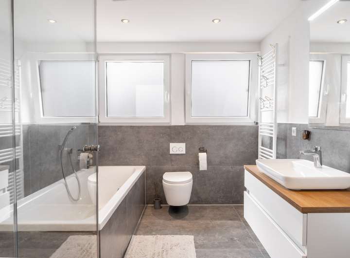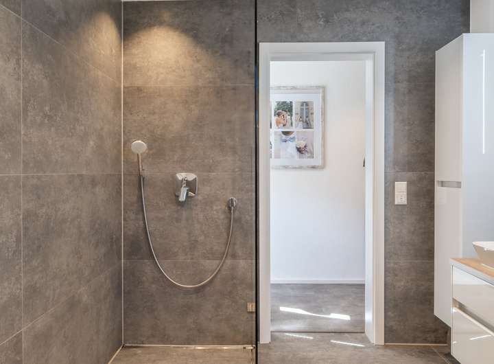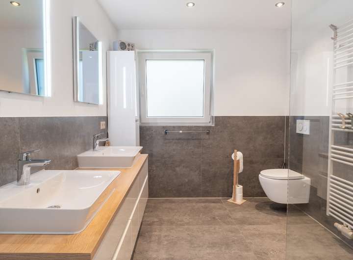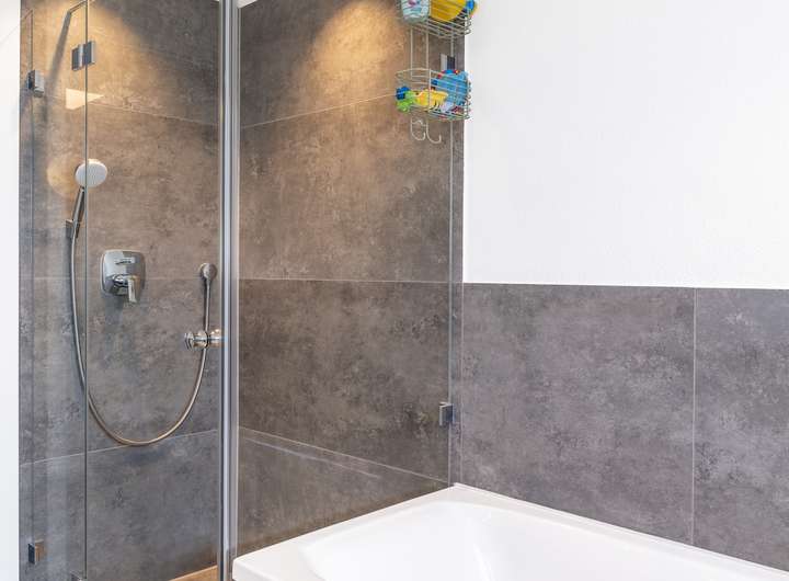 - Zwei moderne Badezimmer mit Walk-in-Dusche und Badewanne