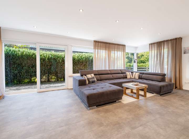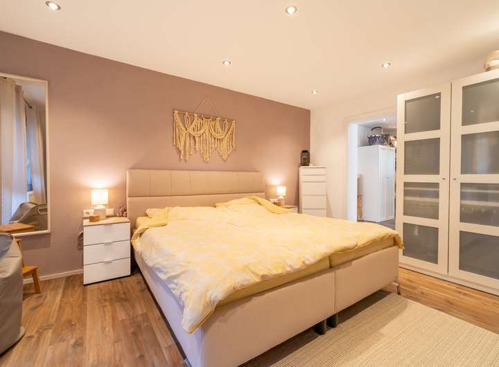 Das Haus wurde 2019 umfassend saniert und präsentiert sich in einem gehobenen und sehr gepflegten Zustand. Das Erdgeschoss besteht aus einem lichtdurchfluteten Wohn- und Essbereich mit Zugang zur Terrasse und Garten. Ein Schlafzimmer sowie ein modernes Badezimmer sind ebenfalls auf dieser Ebene vorzufinden. Weiterhin beinhaltet das Familiendomizil eine moderne Einbauküche, einen Kamin sowie eine große Garage für zwei Fahrzeuge. Insgesamt finden auf dem Grundstück bis zu acht Autos Platz.
