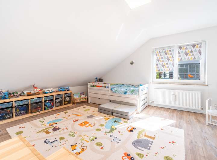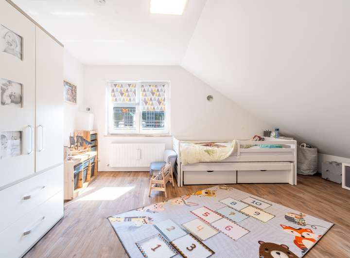 Darüber hinaus liegen auf diesem Stockwerk zwei weitere Kinderzimmer und ein Badezimmer.
