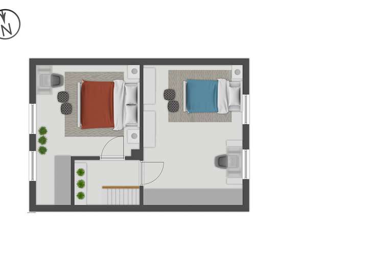 Im Dachgeschoss befinden sich zwei große Zimmer sowie ein Flur. Im Flur befindet sich eine Deckenluke als Zugang zum Spitzboden. Die Wohnfläche im Dachgeschoss beträgt ca. 27 m².