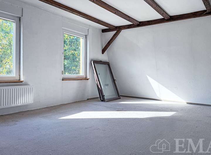 - sichtbare Holzbalken der Dachkonstruktion im Dachgeschoss