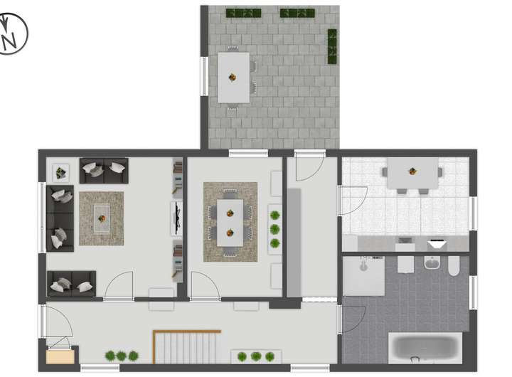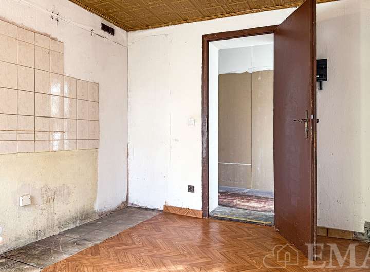 Im Erdgeschoss befinden sich zwei helle Zimmer, ein Badezimmer mit Badewanne, eine Küche sowie ein Flur mit Zugang zur Terrasse. Im Flur befinden sich eine Massivholztreppe in das Dachgeschoss sowie eine Bodenluke in den Teilkeller. Die Wohnfläche im Erdgeschoss beträgt ca. 59 m².