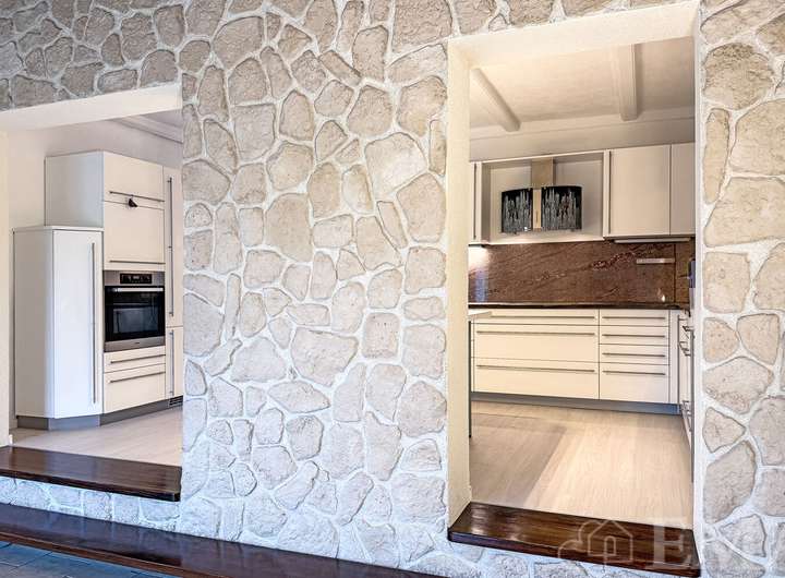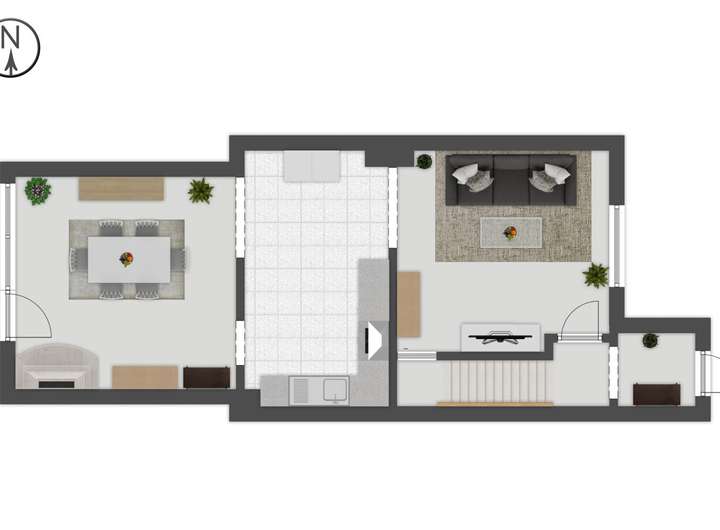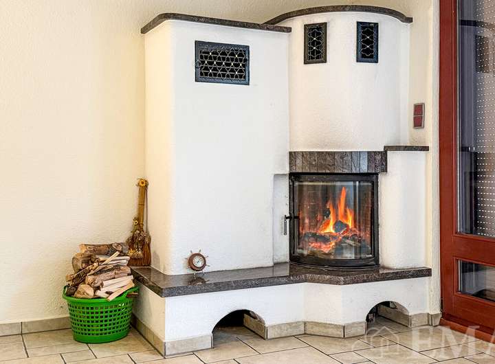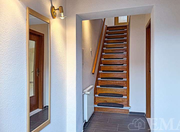 Im Erdgeschoss befinden sich ein Wohnzimmer mit dekorativem Kamin und Zugang zur Westterrasse, ein großes Esszimmer, eine moderne Küche mit Einbauküche sowie ein Flur. Im Flur führt eine Holztreppe in das Dachgeschoss und im Esszimmer in den Vollkeller. Die Wohnfläche im Erdgeschoss beträgt ca. 58 m².