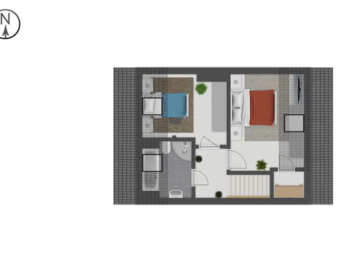 Im Dachgeschoss befinden sich zwei Zimmer, ein Badezimmer mit Badewanne und Dusche sowie ein Flur. Im Flur befindet sich eine Deckenluke als Zugang zum Spitzboden. Die Wohnfläche im Dachgeschoss beträgt ca. 31 m².