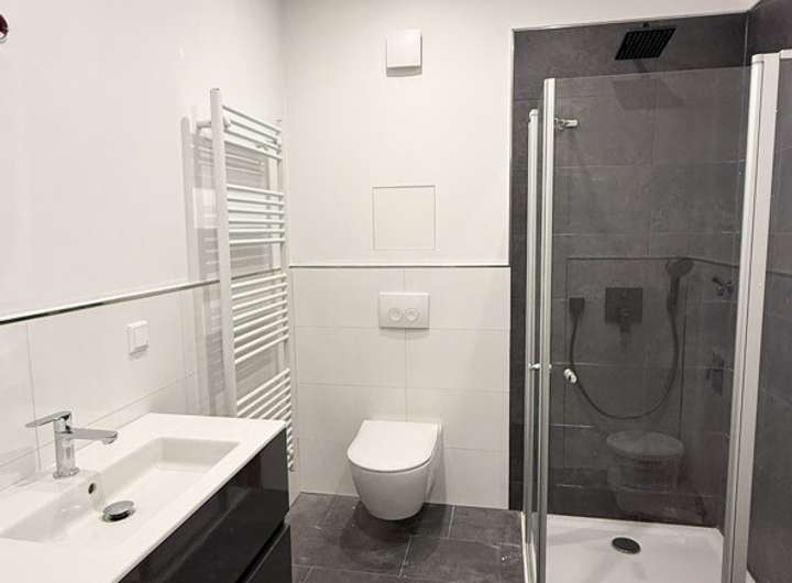 Alle Räume sind mit Fußbodenheizung und freundlichen, hochwertigen Böden ausgestattet, die Heizung ist über WLAN steuerbar. Im Bad wird zusätzlich ein Handtuchheizkörper installiert. Alle Fenster verfügen über elektrische Rollläden.