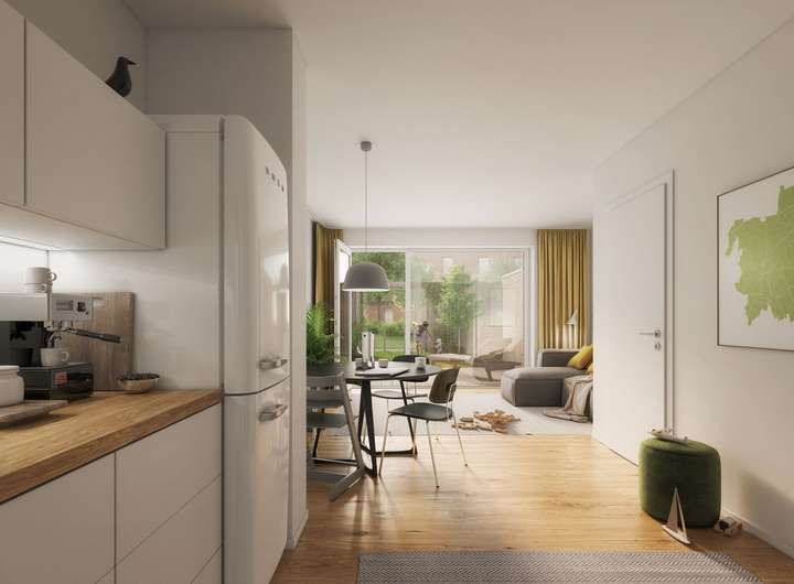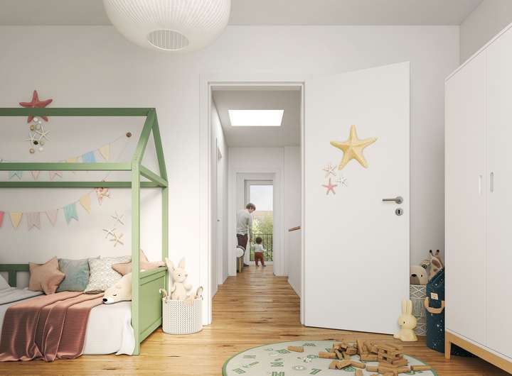 Die großzügig gestalteten Außenanlagen, entworfen von den renommierten nsp Landschaftsarchitekten, bieten Ihnen Raum für Erholung und Begegnung. Betonsitzblöcke, Spielplätze und Sitzbänke laden zum Verweilen und zum Austausch mit Nachbarn ein – ein Quartier, in dem Sie sich von Anfang an zuhause fühlen.