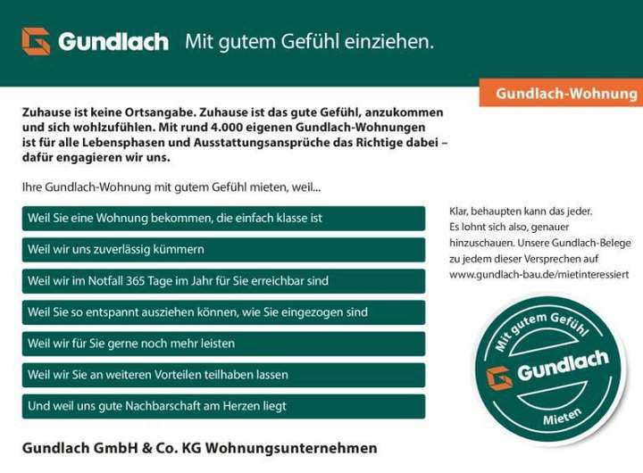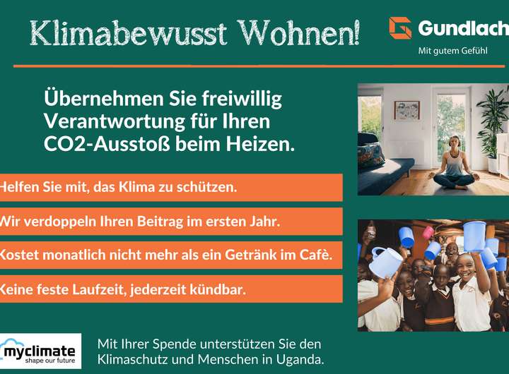 Mit Gundlach können Sie freiwillig einen Beitrag für den Klimaschutz leisten, indem Sie Verantwortung für Ihren CO2-Ausstoß beim Heizen übernehmen. Als Mieter:in spenden Sie 0,03 Euro/m² Wohnfläche pro Monat. Bei Gundlachs Klimainitiative arbeiten wir mit der Stiftung Myclimate zusammen. Für diese Wohnung zahlen Sie dafür nur 3,98 EUR/Monat zusätzlich. Mehr Infos finden Sie unter www.myclimate.org und in unserem Kundenportal.