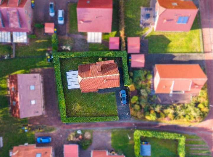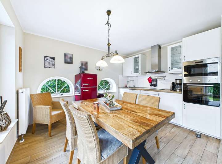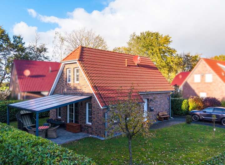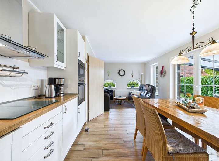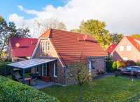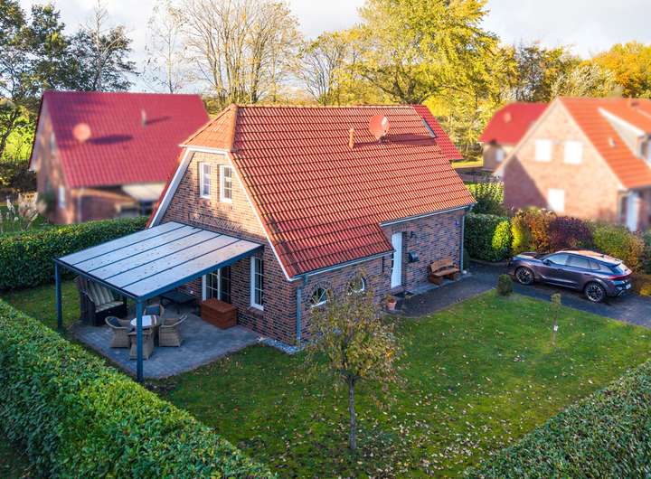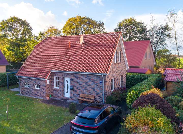 Das Haus ist ebenerdig bewohnbar und verfügt über Jalousien an allen Fenstern. Der offene Wohn- und Essbereich mit direktem Zugang zur sonnigen Terrasse schafft eine helle und einladende Atmosphäre – perfekt zum Entspannen und Genießen. Die Klinkerfassade mit aufwendigen Friesarbeiten in den Giebelwänden unterstreicht die hochwertige Bauausführung und verleiht dem Haus einen charmanten, nordischen Charakter.