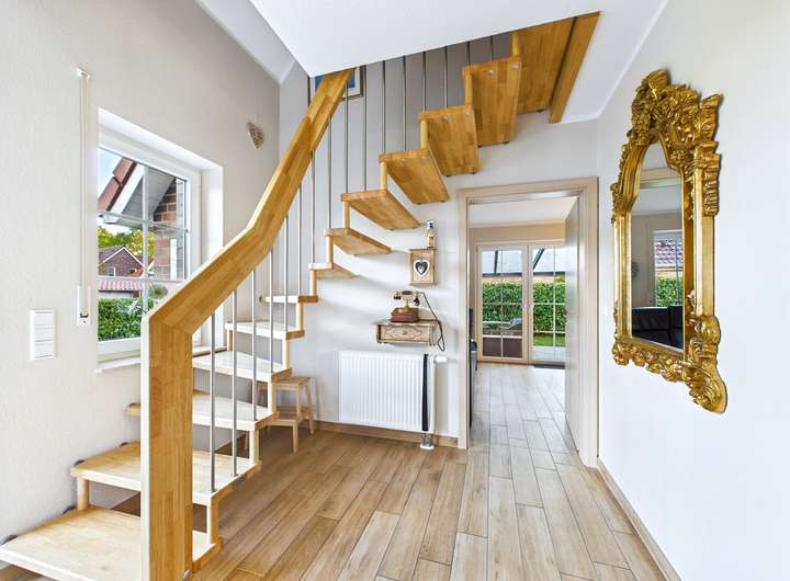 Im gesamten Erdgeschoss wurden Fliesenpaneele in Holzoptik verlegt, die Wärme und Gemütlichkeit ausstrahlen, gleichzeitig aber besonders pflegeleicht sind. Die handlauftragende Treppe aus edlem HEVEA-Holz und Edelstahl führt ins Dachgeschoss, wo sich zwei weitere Zimmer sowie ein separates WC befinden – ideal für Gäste oder zusätzliche Schlafräume. In den Schlafräumen finden Sie Vinylboden in gleicher Optik wieder, was für ein angenehmeres warmes Fußgefühl sorgt.