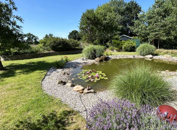 Im Außenbereich erwartet Sie ein liebevoll angelegter Garten mit Teich. Ein kleines Paradies für Kinder zum Entdecken, Spielen und Toben. Ein separates Gartenhaus bietet Platz für Spielzeug, Fahrräder oder Gartengeräte.