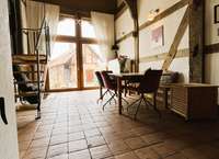 Zwei gemütliche Schlafzimmer, eine großzügige Relax-Ecke und ein stilvolles Badezimmer schaffen ein harmonisches Wohnambiente – ideal für Paare oder Familien, die das Besondere suchen. Die Deckenhöhe von 2,20 m im Obergeschoss sorgt für eine gemütliche Atmosphäre und unterstreicht den authentischen Charakter des Hauses.