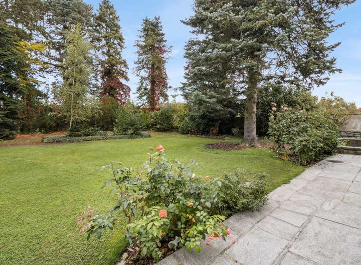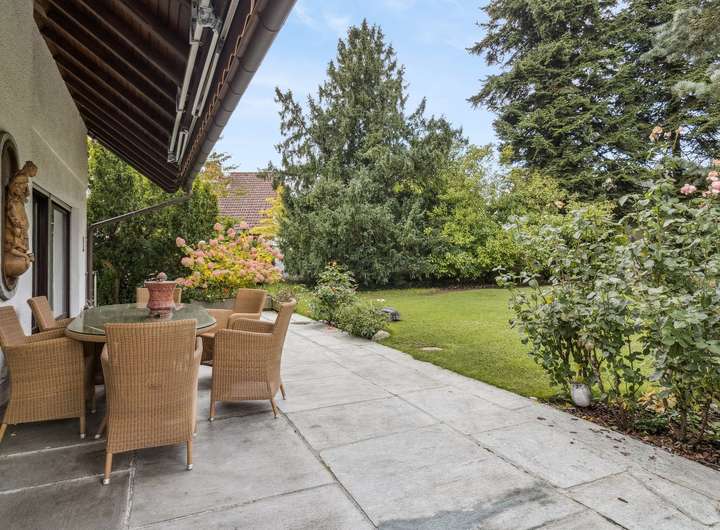 Der Garten ist ein echtes Plus: Ein funktionstüchtiger Brunnen, eine individuell einstellbare Sprenkleranlage sowie ein Rasenmähroboter, dessen elektronische Begrenzung bereits installiert ist, sorgen für eine komfortable Pflege. Alter Baumbestand entlang der Grundstücksmauer schafft zusätzliche Privatsphäre. Im hinteren Bereich befindet sich außerdem ein großer Abstellraum für Gartengeräte, Möbel oder Kaminholz.