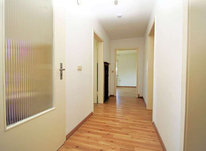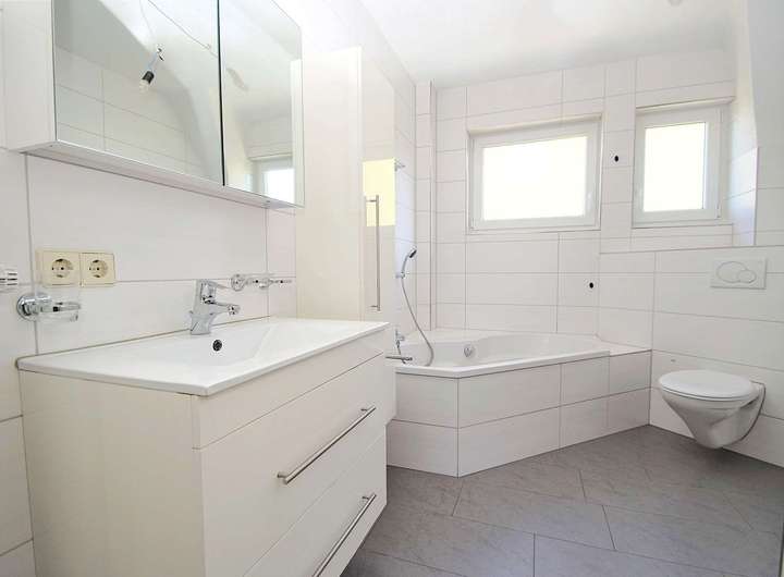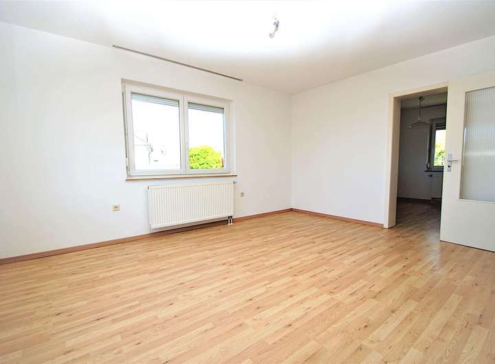 Gas-Zentralheizung, Isolierverglaste Kunststofffenster mit Kunststoffrollläden, Laminat- und Fliesenböden, Wohlfühlbad mit Wanne und Dusche, neue Einbauküche, große Terrasse, Abstellraum, Keller, Außenstellplatz, auf Wunsch Garten.