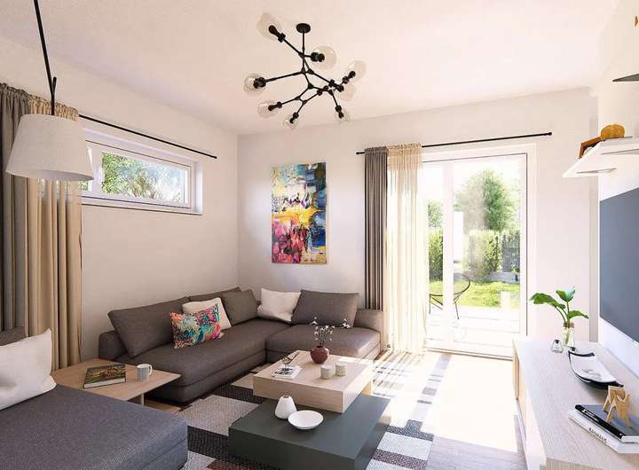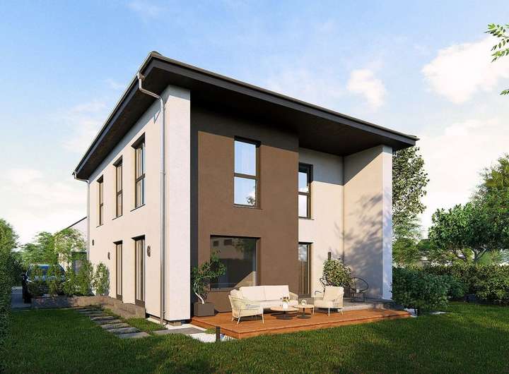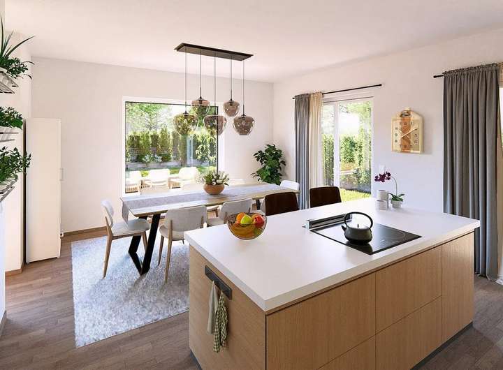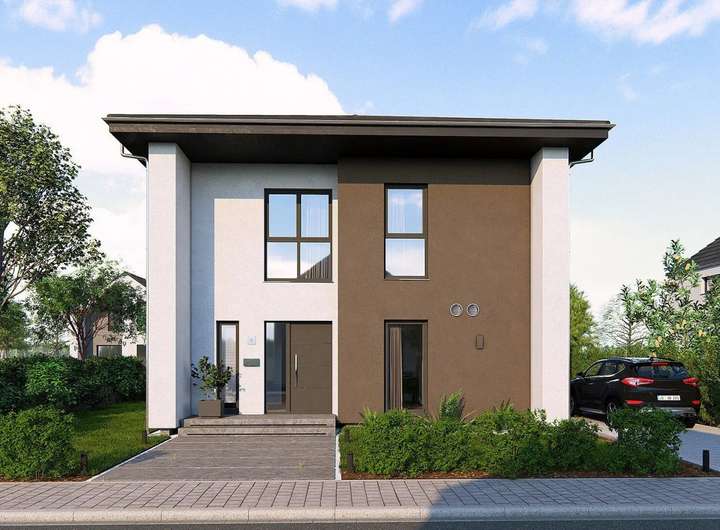 Das Pur 4 folgt einem klaren Gestaltungskonzept: Reduktion auf das Wesentliche ohne Verzicht auf Komfort. Die geradlinige Architektur mit großen Fensterflächen sorgt für lichtdurchflutete Räume und schafft eine offene, einladende Atmosphäre. Die moderne Putzfassade unterstreicht den puristischen Charakter des Hauses.