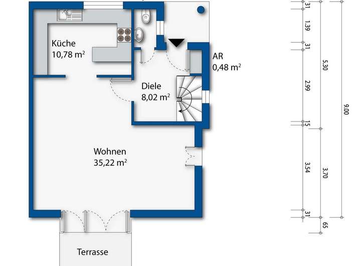 In dem hellen Wohn- und Essbereich mit bodentiefen Fenstern und angrenzender Terrasse wurden Holzdielen in Lärche verlegt. Die moderne neuwertige Einbauküche mit Lackfront in hellgrau matt lässt keine Wünsche offen. Hier haben Sie viel Platz zum Zaubern toller Gerichte für Ihre Lieben, und morgens können Sie Ihren Kaffee oder Tee direkt am Tresen genießen. Im Erdgeschoss finden Sie neben der Diele noch ein Gäste WC.