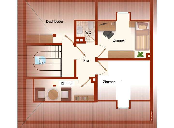 Das Dachgeschoss bietet drei weitere Räume sowie eine nicht ausgebaute Fläche, die als zusätzliche Abstellfläche dient. Hier befindet sich auch eine Toilette. Eines der Zimmer hat in 2020/2021 eine neue Elektrik mit LAN und TV erhalten.