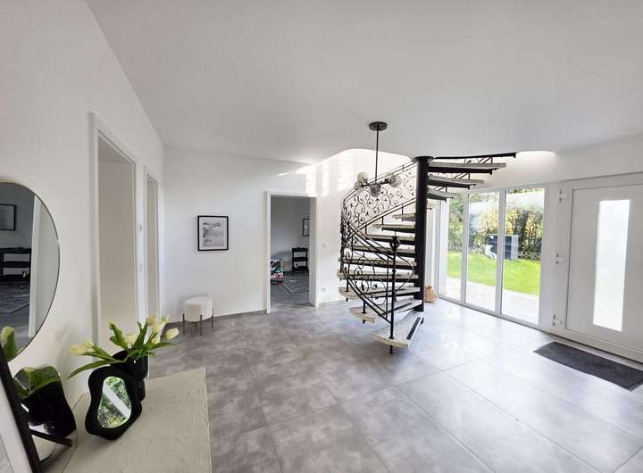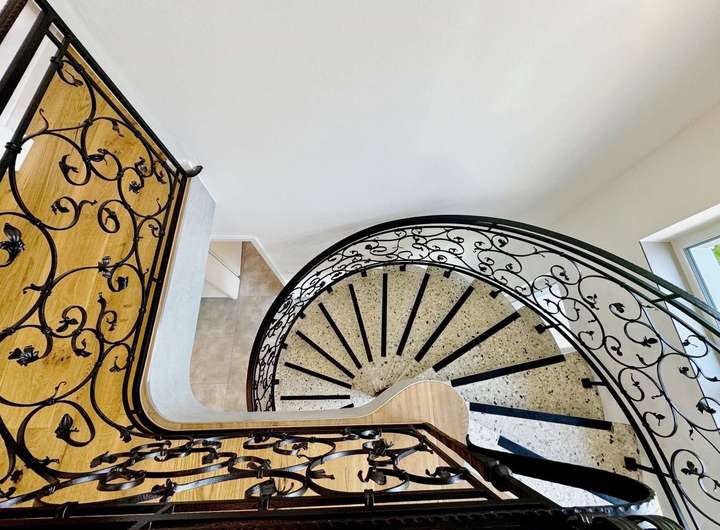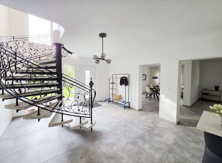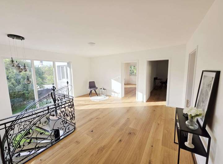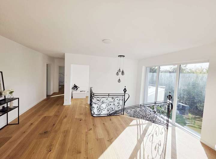 Über die elegante Wendeltreppe gelangen Sie ins Obergeschoss, wo Sie ein großzügiges Wohnzimmer, drei helle Schlafzimmer, ein stilvolles Vollbad mit Badewanne und Dusche, eine Ankleide sowie ein überdachter Balkon erwarten – perfekt, um den Tag in Ruhe ausklingen zu lassen.