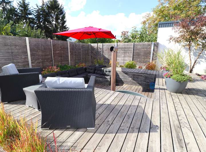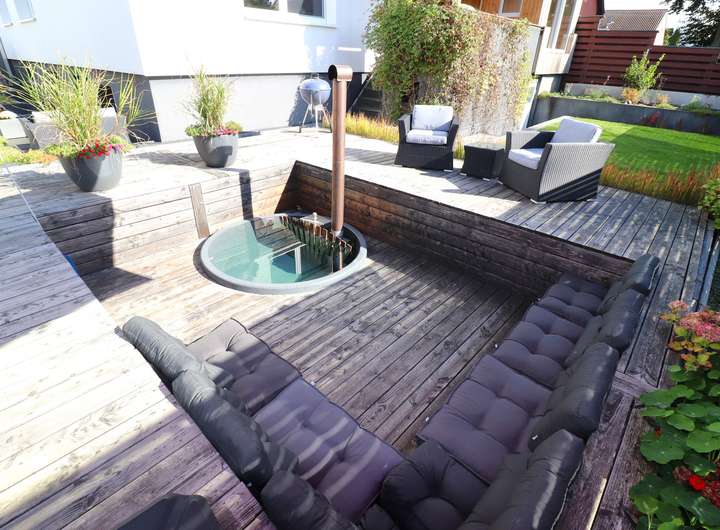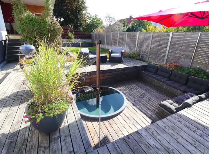 • Outdoor-Wellnessbereich mit Lounge und Hot Tub Badezuber