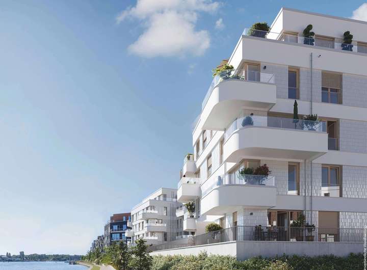Dieses Duett von Eleganz und Stil umfasst 52 Wohnungen in unvergleichlich ästhetischer Architektursprache. Die außergewöhnliche Form der beiden Gebäude ermöglicht jeder Wohnung einen freien Blick aufs Wasser. Dank der leicht verspringenden, runden Balkone genießen Bewohner besonders viel Sonne, da eine gegenseitige Beschattung vermieden wird. Die Glasbrüstungen ermöglichen es, den wunderschönen Blick auf die Dahme aus jeder Perspektive zu genießen.