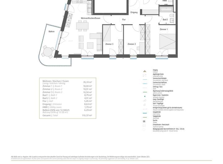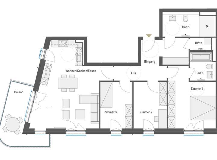 Die großzügigen Wohn-Ess-Bereiche werden durch bodentiefe Fenster mit natürlichem Licht durchflutet und schaffen eine offene Atmosphäre. Alle Wohnungen verfügen über ein barrierearmes Duschbad, die meisten 3- bis 4-Zimmer-Wohnungen zusätzlich über ein Wannenbad oder ein Gäste-WC.