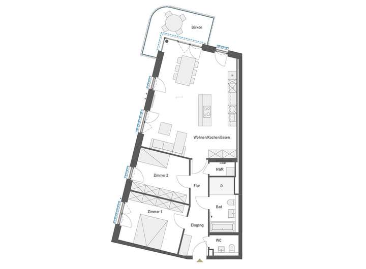 Die großzügigen Wohn-Ess-Bereiche werden durch bodentiefe Fenster mit natürlichem Licht durchflutet und schaffen eine offene Atmosphäre. Alle Wohnungen verfügen über ein barrierearmes Duschbad, die meisten 3- bis 4-Zimmer-Wohnungen zusätzlich über ein Wannenbad oder ein Gäste-WC.