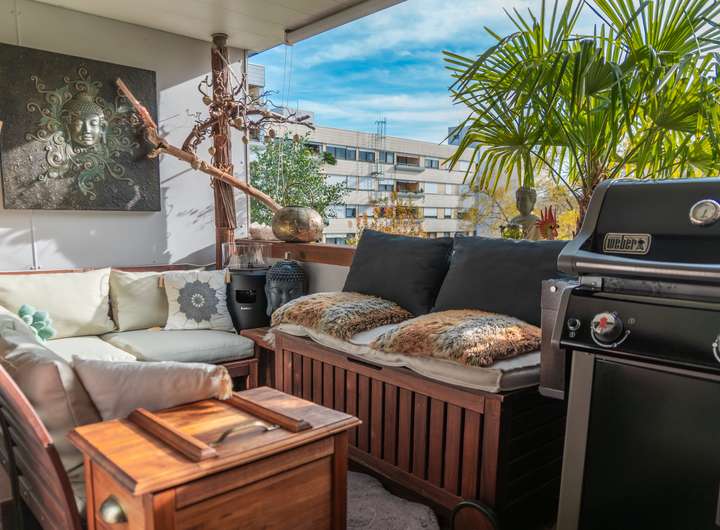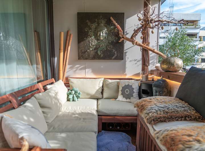 - Lounge-Balkon mit Holzboden & Holzdecke