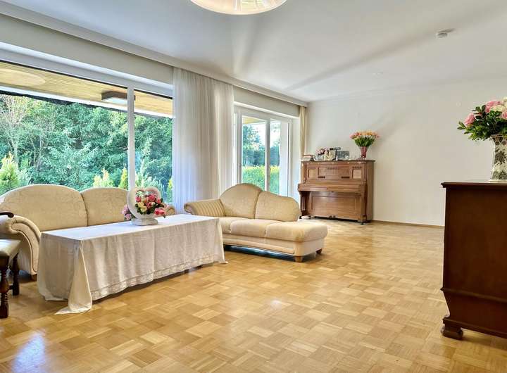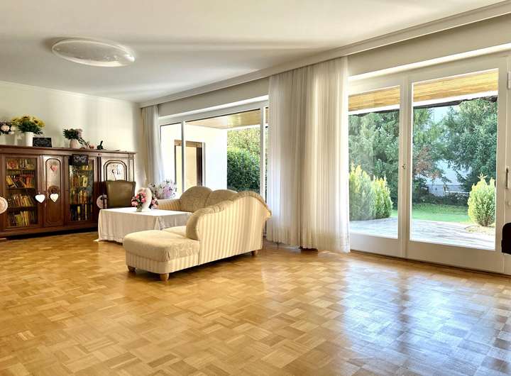 Das Wohnzimmer mit offenem Essbereich verfügt über ca. 50,83 m² Wfl. und bietet mit den riesigen Fenstern einen wunderbaren Blick auf die Terrasse mit Süd-West-Ausrichtung sowie das Grün des eigenen Gartens.