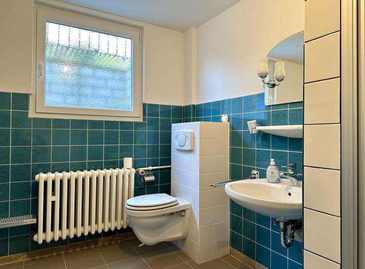 Ein großzügiges Schlafzimmer, ein weiteres Kinder- oder Arbeitszimmer, die gemütliche Küche, ein Tageslichtbad, ein Gäste-WC sowie ein weitläufiger Flur vollständigen die Wohnung im Hochparterre.
