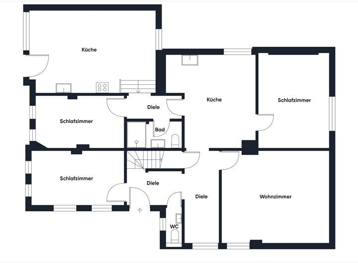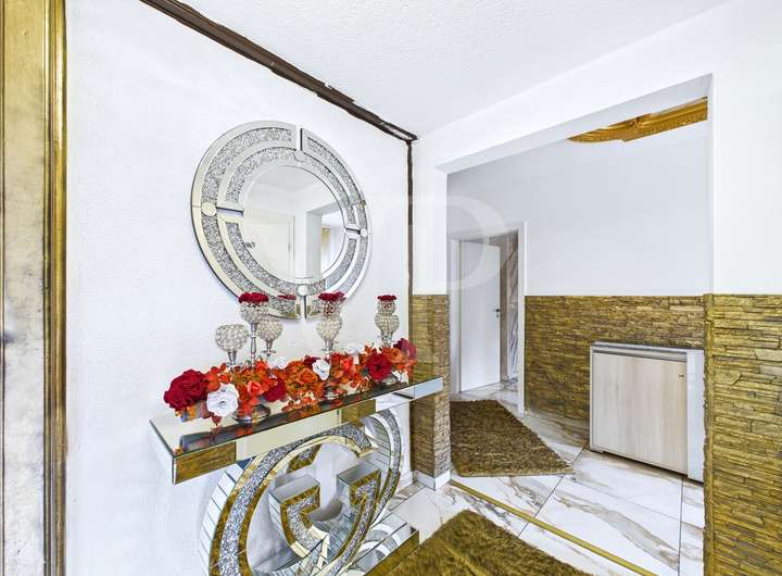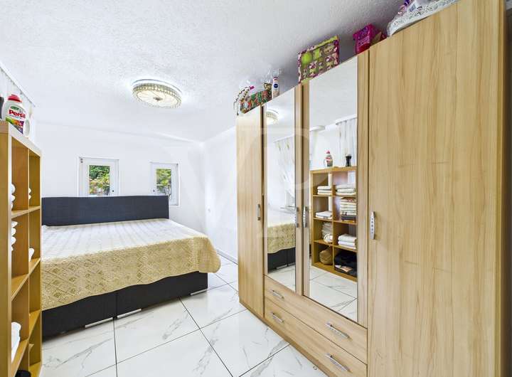 Bereits beim Betreten des Hauses empfängt Sie ein Flur, von dem aus Sie in das erste Schlafzimmer sowie das praktische Gäste-WC gelangen. Das Herzstück des Erdgeschosses bilden das helle, großzügige Wohnzimmer und die Küche. Weiterhin befinden sich im Erdgeschoss zwei weitere Schlafzimmer, ein Badezimmer sowie eine zusätzliche Küche – ideal für Familien oder Gäste.
